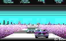 Simulador arcade de coches en CGA, con unas pendientes que harán que tu coche salté algo más de lo normal.